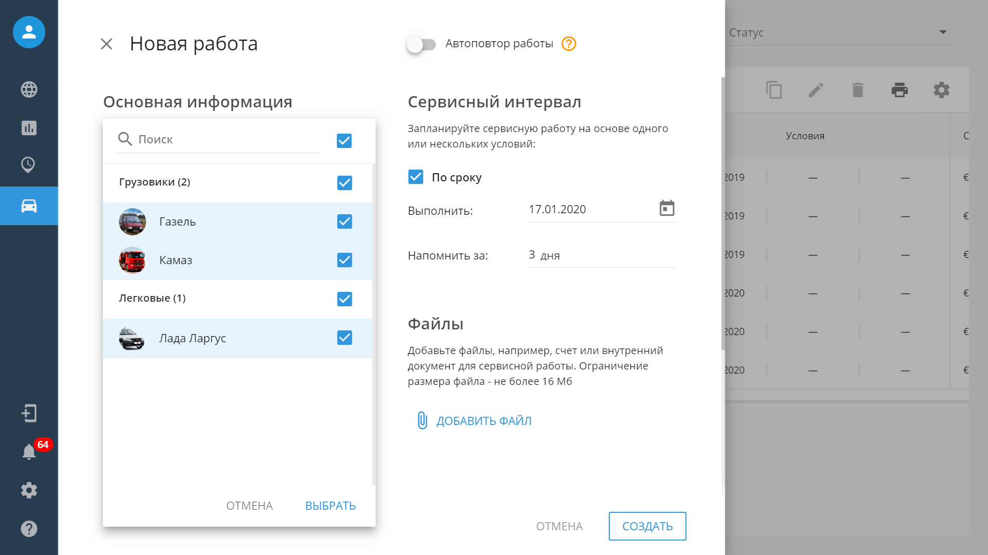 Теперь в модуле «Техобслуживание» механик может создать типовые сервисные работы для группы транспортных средств, просто выбрав нужные объекты из списка. Кроме того, пользователи могут назначить работу повторяющейся, включив «Автоповтор». Это сократит время, избавит от рутинных операции за счет автоматизации регулярного технического обслуживания автомобилей.
